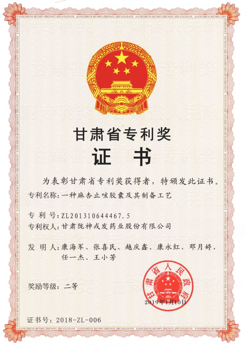 2月14日,甘肅省科學(xué)技術(shù)專利獎(jiǎng)勵(lì)大會(huì)在寧臥莊賓館隆重召開。隴神戎發(fā)發(fā)明專利“一種麻杏止咳膠囊及其制備工藝”榮獲2018年甘肅省專利獎(jiǎng)二等獎(jiǎng)。此次獲獎(jiǎng)專利中,一等獎(jiǎng)5項(xiàng),二等獎(jiǎng)20項(xiàng),三等獎(jiǎng)25項(xiàng)。