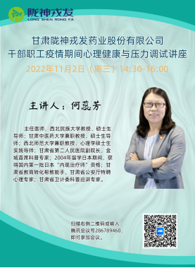 為有效緩解新冠肺炎疫情導致的負面影響,幫助公司干部職工積極預防和減輕疫情所造成的心理障礙及負面情緒,保障公司干部職工身心健康,11月2日下午,公司特邀甘肅省第二人民醫(yī)院副院長,西北民族大學教授、碩士生導師何蕊芳教授為公司干部職工開展“疫情期間心理健康與壓力調試”線上講座,公司近百名職工在線學習。