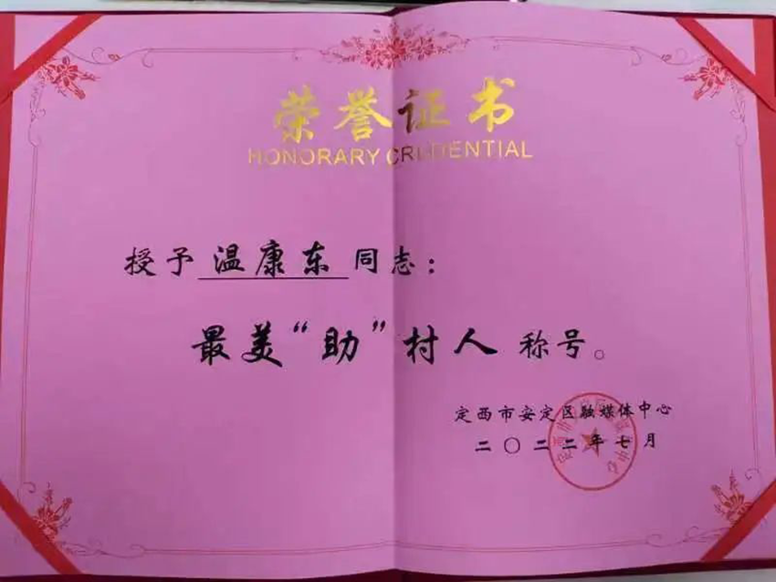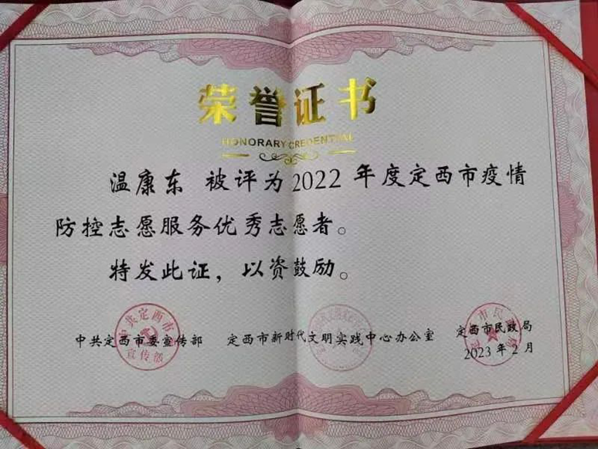 溫康東自2021年9月?lián)味ㄎ魇邪捕▍^(qū)李家堡鎮(zhèn)紅川村第一書記、幫扶工作隊隊長以來,他堅持立足平凡崗位,踐行志愿精神,不惜拋灑青春,為山區(qū)奉獻(xiàn)青春,用自己的“辛苦指數(shù)”換來群眾的“幸福指數(shù)”,他的真情奉獻(xiàn)贏得了身邊黨員群眾的一致好評,是公認(rèn)的志愿榜樣,2022年被評選為定西市安定區(qū)“最美助村人”,2023年被定西市2022年度學(xué)雷鋒志愿服務(wù)先進(jìn)典型評選工作小組評選為定西市“疫情防控優(yōu)秀志愿者”。