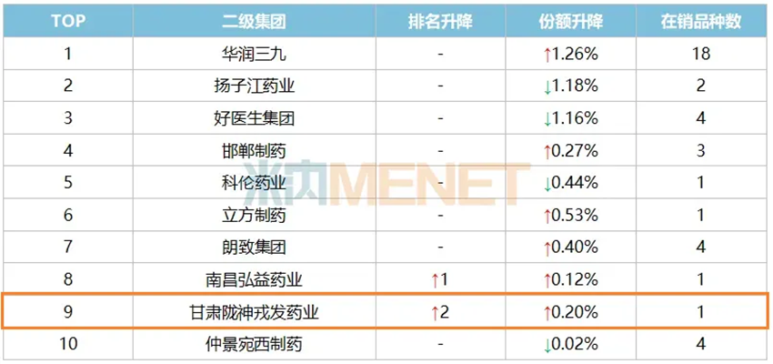 同時,在2025年Q1中成藥胃藥(胃炎、潰瘍)二級集團(tuán)中,甘肅隴神戎發(fā)藥業(yè)排名上升2位至TOP9、銷售額增長了8.95%。