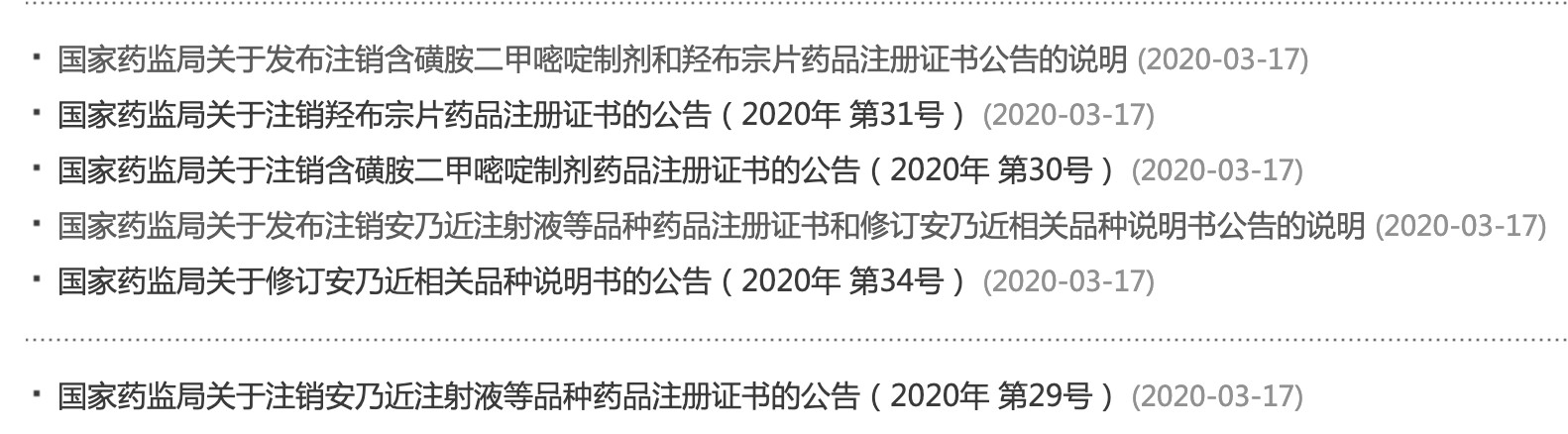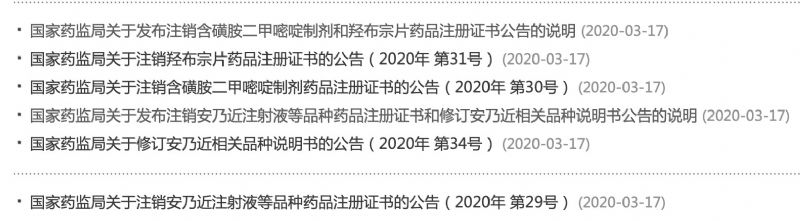 2020年03月17日國家藥品監(jiān)督管理局(NMPA)連續(xù)發(fā)布了6個關(guān)于安乃近注射液、含磺胺二甲嘧啶制劑、羥布宗片等品種注銷公告。
