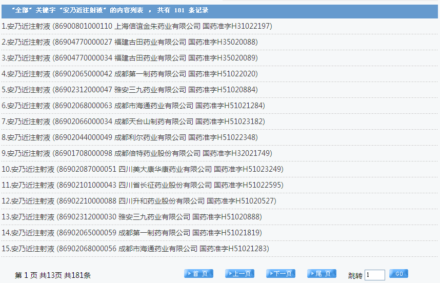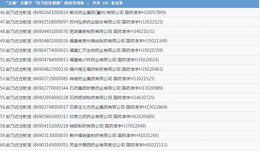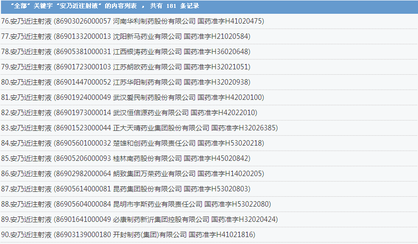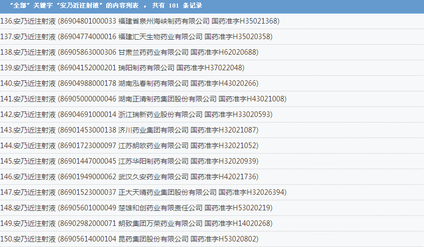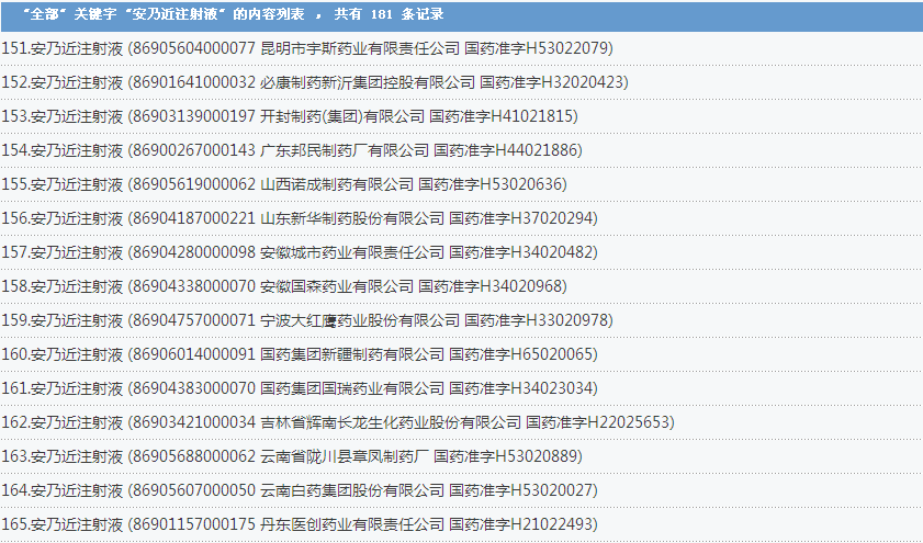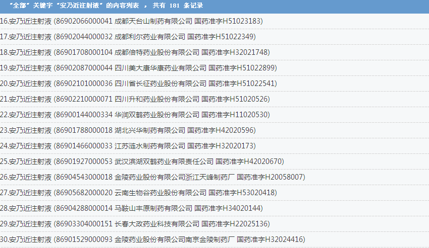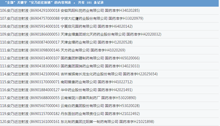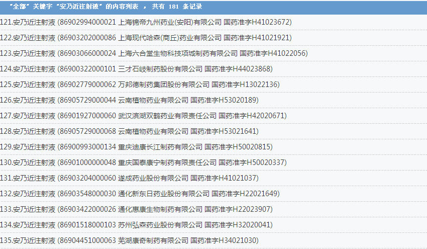 安乃近注射液:國內(nèi)共有181個批準文號,涉及了上海信誼金朱藥業(yè)有限公司、福建古田藥業(yè)有限公司、成都第一制藥有限公司等企業(yè):