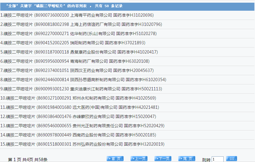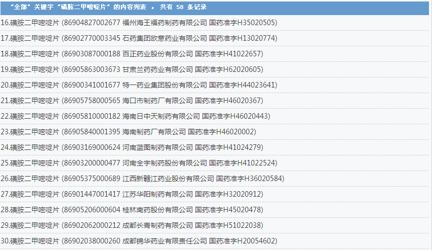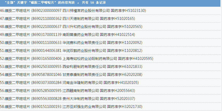 磺胺二甲嘧啶片:58個批準文號