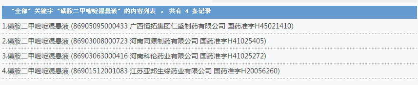 磺胺二甲嘧啶混懸液:4個批準文號