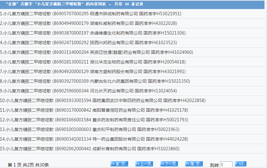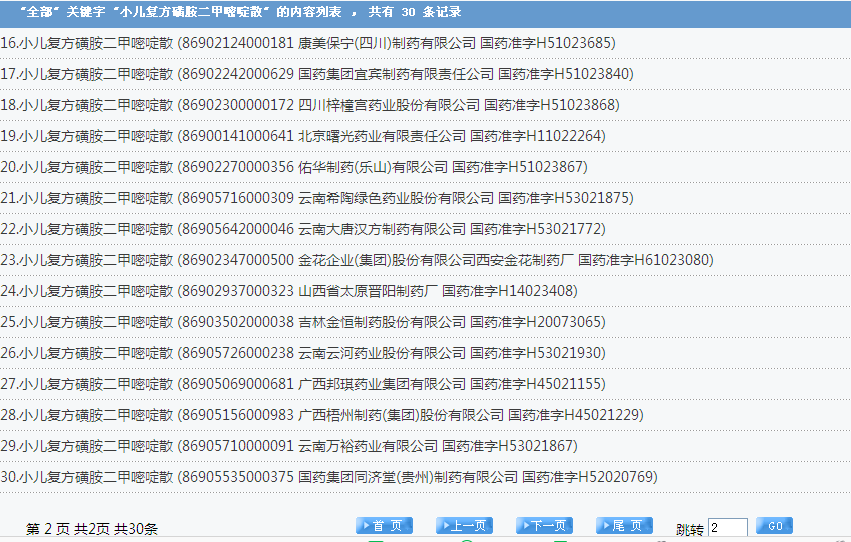 小兒復(fù)方磺胺二甲嘧啶散:30個批準文號: