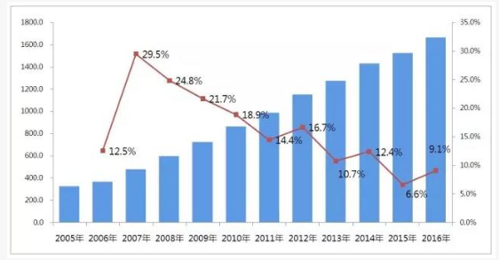 從樣本醫(yī)院市場表現(xiàn)來看,藥品銷售已經(jīng)從前幾年的20%左右的增速放緩至10%左右。國內(nèi)樣本醫(yī)院數(shù)據(jù)顯示,PDB樣本醫(yī)院整體市場由2005年的326.9億元,上升至2016年的1661.5億元,2005-2016年復(fù)合增長率為16.9%。