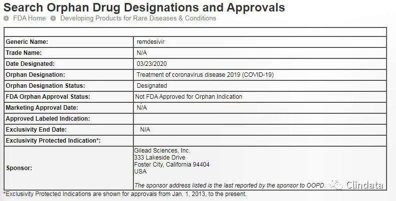 3月23日,F(xiàn)DA官網(wǎng)數(shù)據(jù)庫顯示,FDA授予吉利德科學(Gilead Sciences)公司開發(fā)的在研抗病毒療法瑞德西韋(remdesivir)孤兒藥資格(Orphan Drug Designation),其適應(yīng)癥為冠狀病毒疾病2019(COVID-19)。