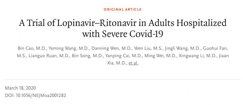 3月18日,眾所期待的洛匹那韋-利托那韋治療新冠臨床試驗結(jié)果,在《新英格蘭醫(yī)學雜志》上發(fā)布,結(jié)果讓人失望,在重癥患者中,與常規(guī)治療相比,研究未能觀察到洛匹那韋-利托那韋治療的有效性。