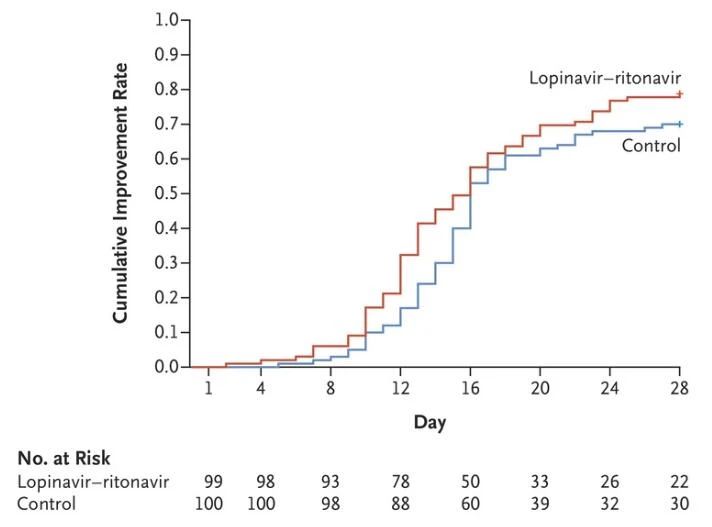 臨床癥狀改善:兩組患者出現(xiàn)臨床狀況改善中位時間相同,均為16天。洛匹那韋-利托那韋組與常規(guī)治療組患者的風險比為1.31(95% 置信度,0.95-1.80),未能表現(xiàn)出顯著差異。