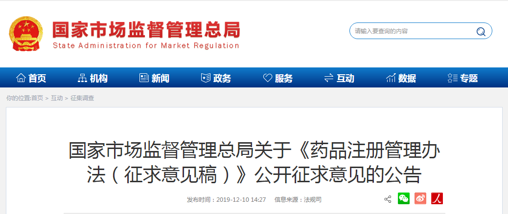 為貫徹落實(shí)新頒布的《中華人民共和國(guó)疫苗管理法》《中華人民共和國(guó)藥品管理法》,規(guī)范藥品注冊(cè)行為,保證藥品的安全、有效和質(zhì)量可控,現(xiàn)將國(guó)家藥監(jiān)局起草的《藥品注冊(cè)管理辦法(征求意見稿)》向社會(huì)公開征求意見,公眾可通過以下途徑和方式提出意見: