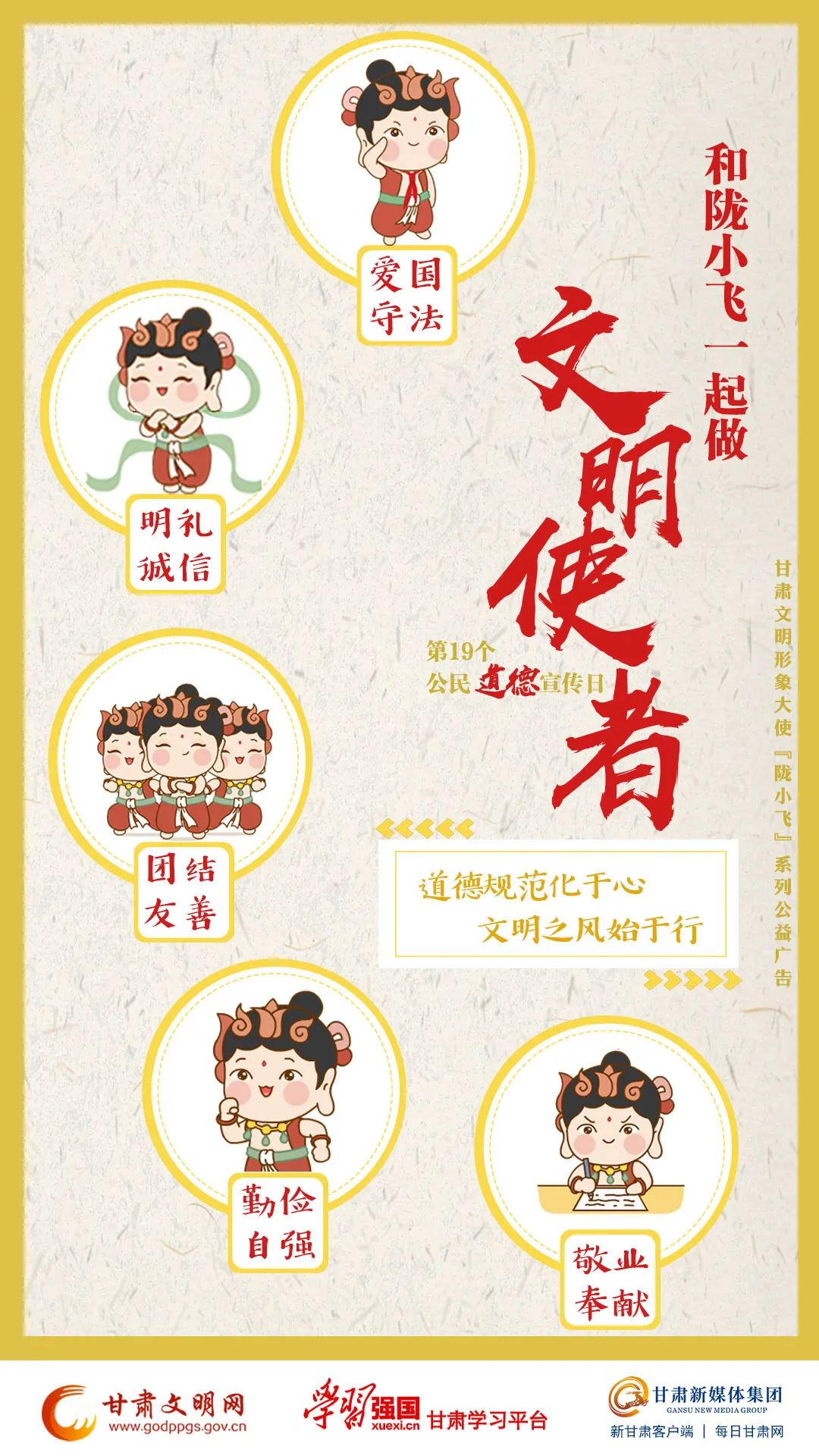 今年是中共中央頒發(fā)《公民道德建設(shè)實施綱要》20周年,為大力倡導“愛國守法、明禮誠信、團結(jié)友善、勤儉自強、敬業(yè)奉獻”20字基本道德規(guī)范,省文明辦特推出“和隴小飛一起做文明使者”公益海報。